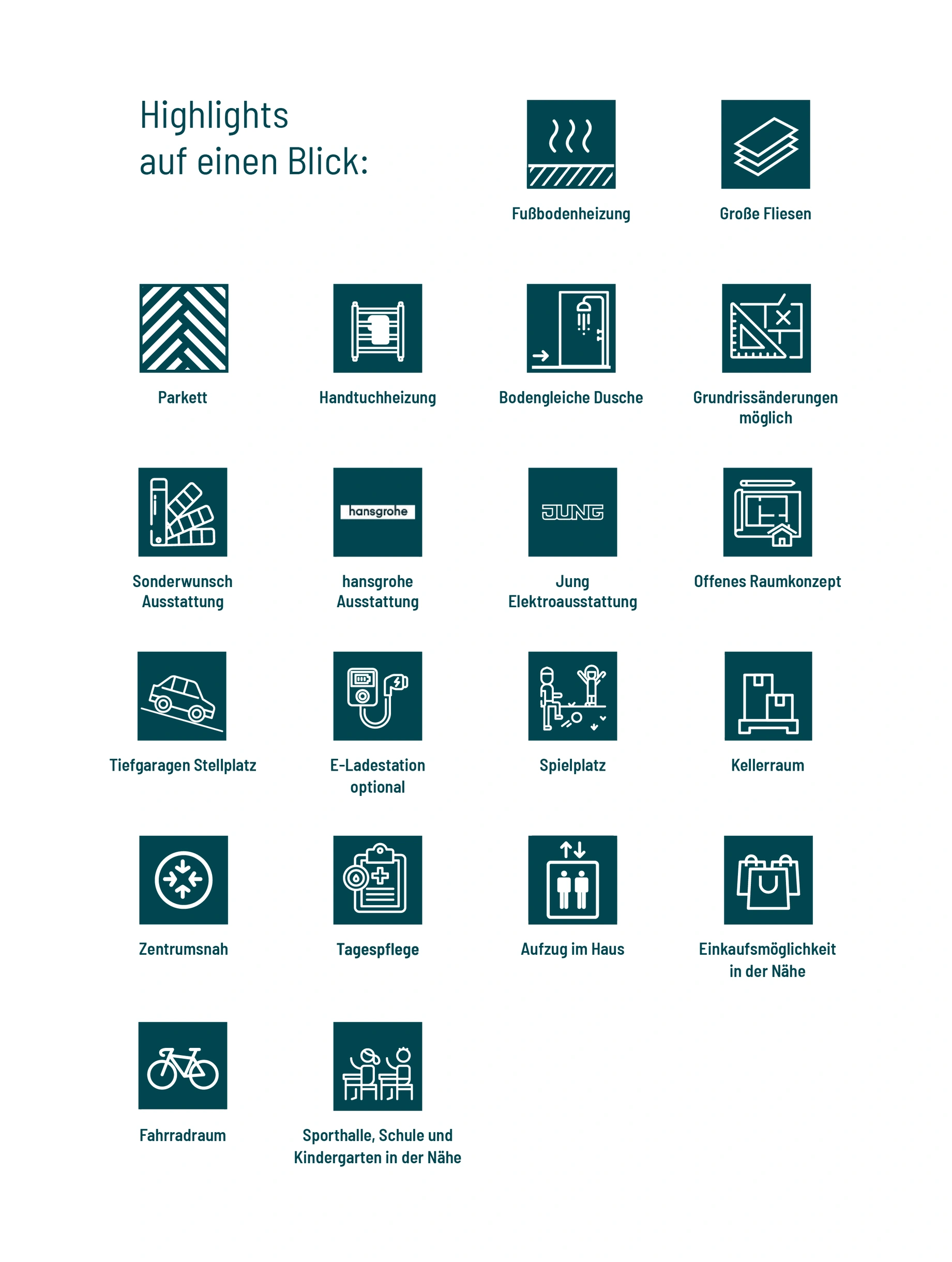 Durch großzügige Glasflächen und Grundrissaufteilungen entstehen attraktive Wohnungen mit lichtdurchfluteten Räumen und einem sehr hohen Wohlfühlfaktor. Ein moderner Aufzug pro Wohnhaus erleichtert Ihren Alltag. Durch eine massive und solide Bauweise werden Sie sehr lange Freude an Ihrer neuen Immobilie haben.